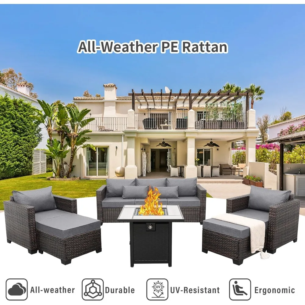 A 6-piece Outdoor Patio Furniture Set, Including An Outdoor Modular Rattan Sofa, An Adjustable Fireplace, and A Table
